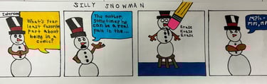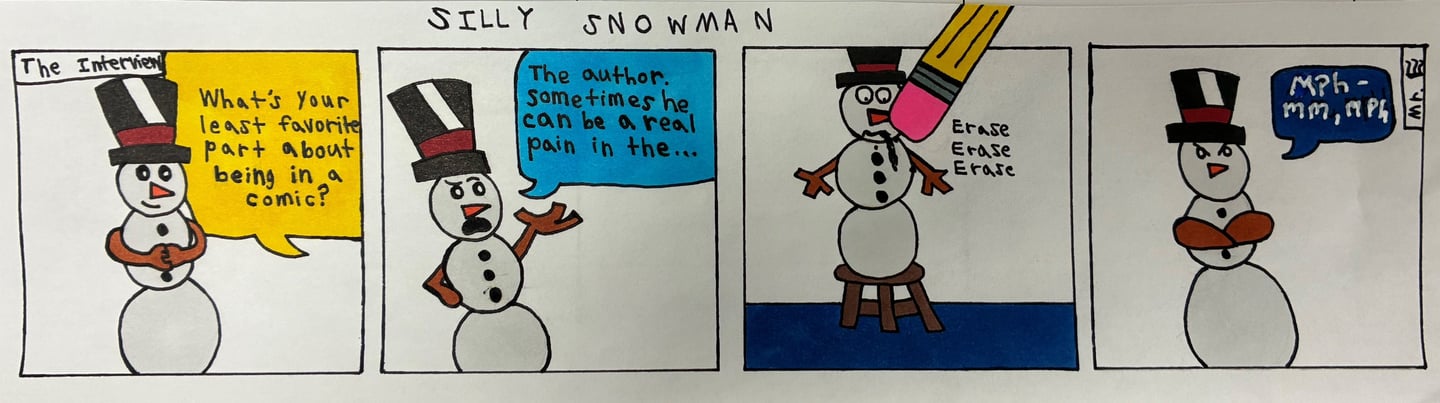 Mr. E. Person is an anonymous short strip comic writer with an endless, creative imagination. Though he remains anonymous, there are a few people that know, including his friends and teachers. He is known for his clumsy and goofy comic book friend, Silly Snowman. This comic book creater has several characters, Silly Snowman is his most well known. For such a fun and silly character, Mr. E Person claims that he doesn’t know where his inspiration comes from. He explains, "I just try to think of something that could make someone laugh.” Of course, you could probably guess Mr. E. Person has a life outside of comics. He states that “I work on my comics when I have free time, and when I get a moment of inspiration.”